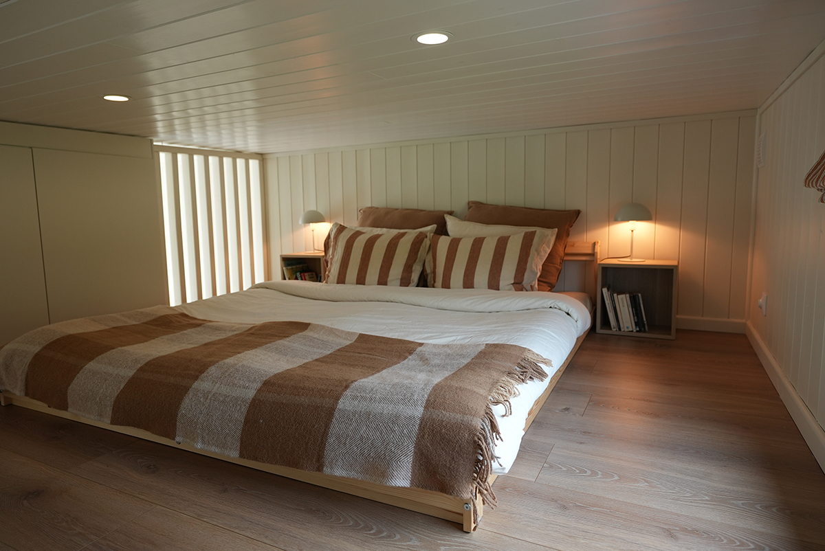 Den platsbyggda trappan leder upp till loftet där det finns gott om plats för en dubbelsäng. Däruppe har vi också skapat möjlighet för förvaring i 2st garderober. Man kan även skapa förvaring utmed väggarna om man så önskar.