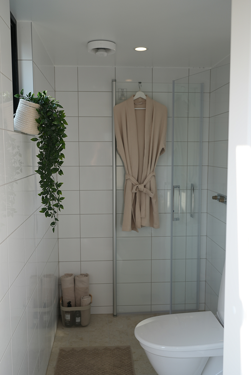 Det helkaklade badrummet har fönster, wc, handfat med kommod och spegelskåp, duschhörna med glasdörrar, golvvärme och plats för liten tvättmaskin. Självklart ingår det också en varmvattenberedare.