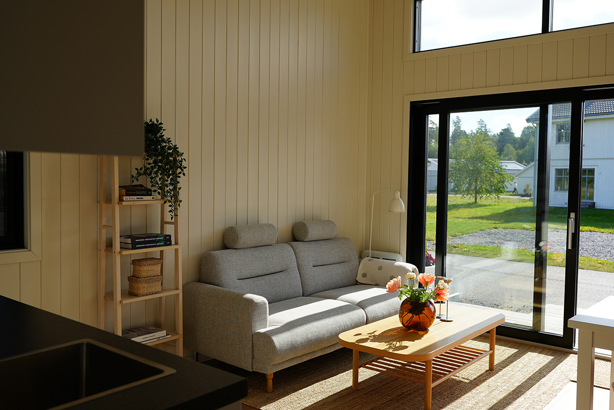 Huset har ett stort skjutdörrsparti på gaveln som släpper in mycket ljus och som därför gör huset extra trevligt att vara i. Vi har utnyttjat varje centimeter för att du som kund ska få så mycket utrymme som möjligt.