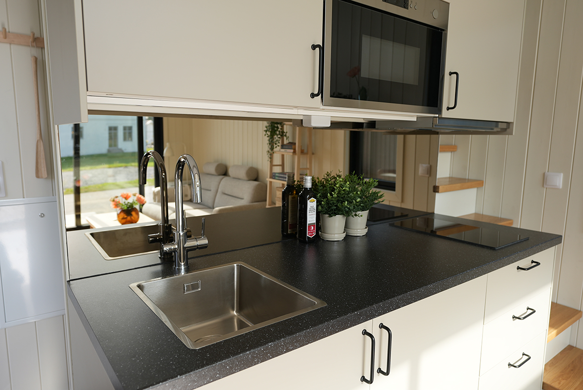 I vårt visningshus finns en diskho med köksblandare, kylskåp, induktionshäll, mikrovågsugn och köksfläkt men vi kan få in en kyl/frys, ugn och en diskmaskin (45 cm bred).